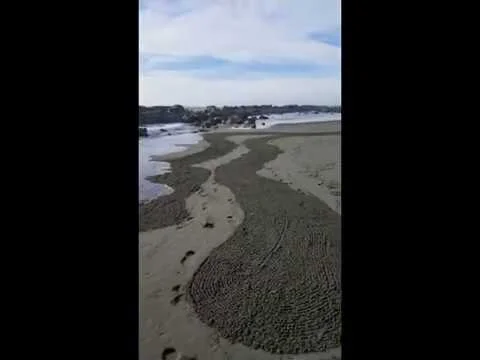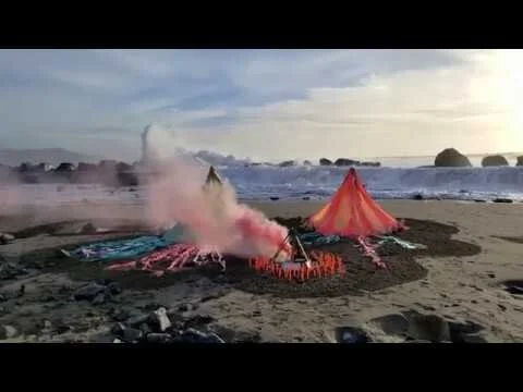 For the next three hours, with my back to the ocean, I defiantly went about my business. I cobbled shelter out of painted parachutes, erected a fake campfire to both boil my water and keep away nighttime predators and then hung my kelp to dry. I ceremoniously fortified the perimeter with the slender tracings of my zen-like rake, all while contemplating the story of the Three Little Pigs. Motorcycles could be heard chewing hills in the distance, while annoying children disregarded my boundary. The tide was rising and, with the waves stacked high upon its shoulders, kept forcing me back out to defend my property line against its salty gentrification.